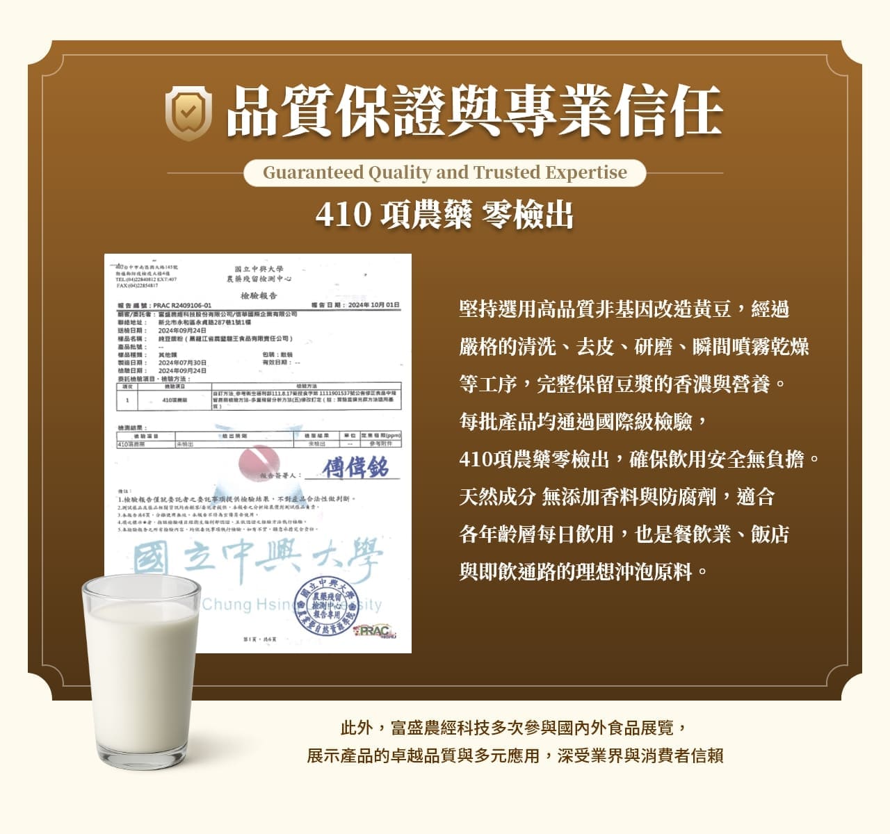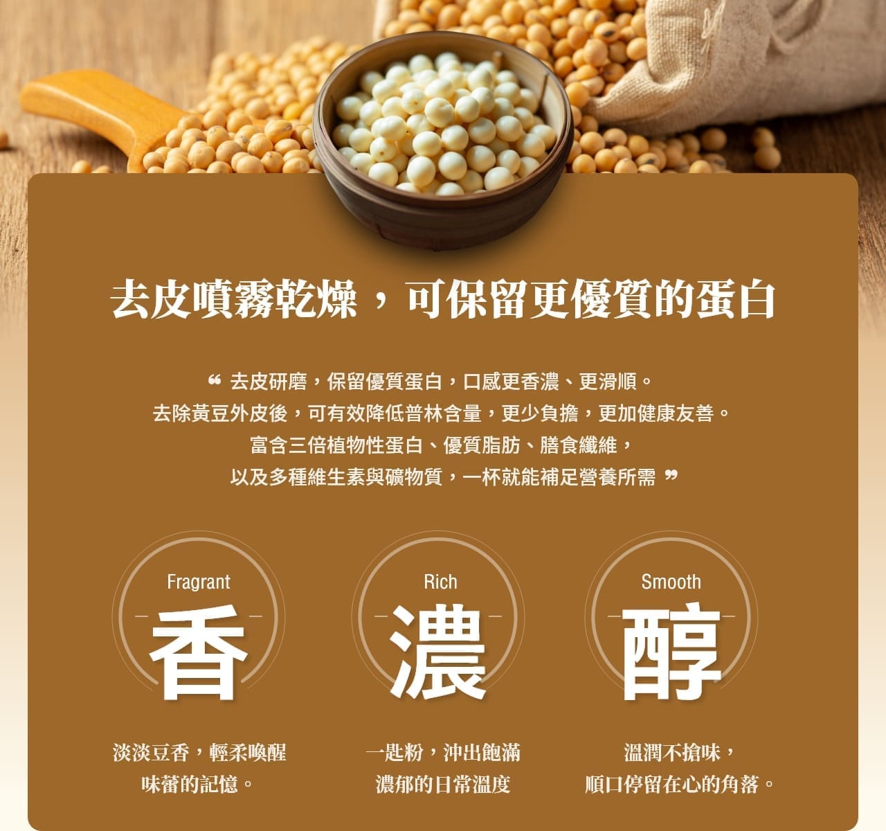 濃、純、香──高達 43% 優質植物蛋白,營養補給新選擇。專為年長者設計,快速補充每日所需營養;同時也是素食者理想的高蛋白來源。 採用高科技製程製成沖泡豆漿粉,保存容易、營養價值高,風味香濃純粹。 搭配自動化豆漿沖泡機,不僅節省人力研磨時間,更有效降低勞動成本,達成營運與營養的雙重優化。