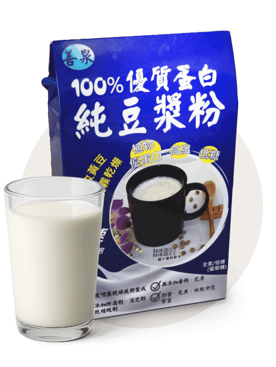 善泉豆漿粉適合一般大眾作為日常營養補充品。特別適合以下族群:需要補充蛋白質者: 例如健身族、運動員、成長中的青少年,以及食慾不振或牙口不好的長者。需要補充膳食纖維者: 例如排便不順暢、蔬果攝取不足的族群。乳糖不耐症者: 豆漿是不含乳糖的飲品,可作為牛奶的替代品。素食者: 善泉豆漿粉不含任何動物成分,是素食者的優質蛋白質來源。注重健康者: 善泉豆漿粉無添加防腐劑、人工香料及色素,是天然健康的選擇。
